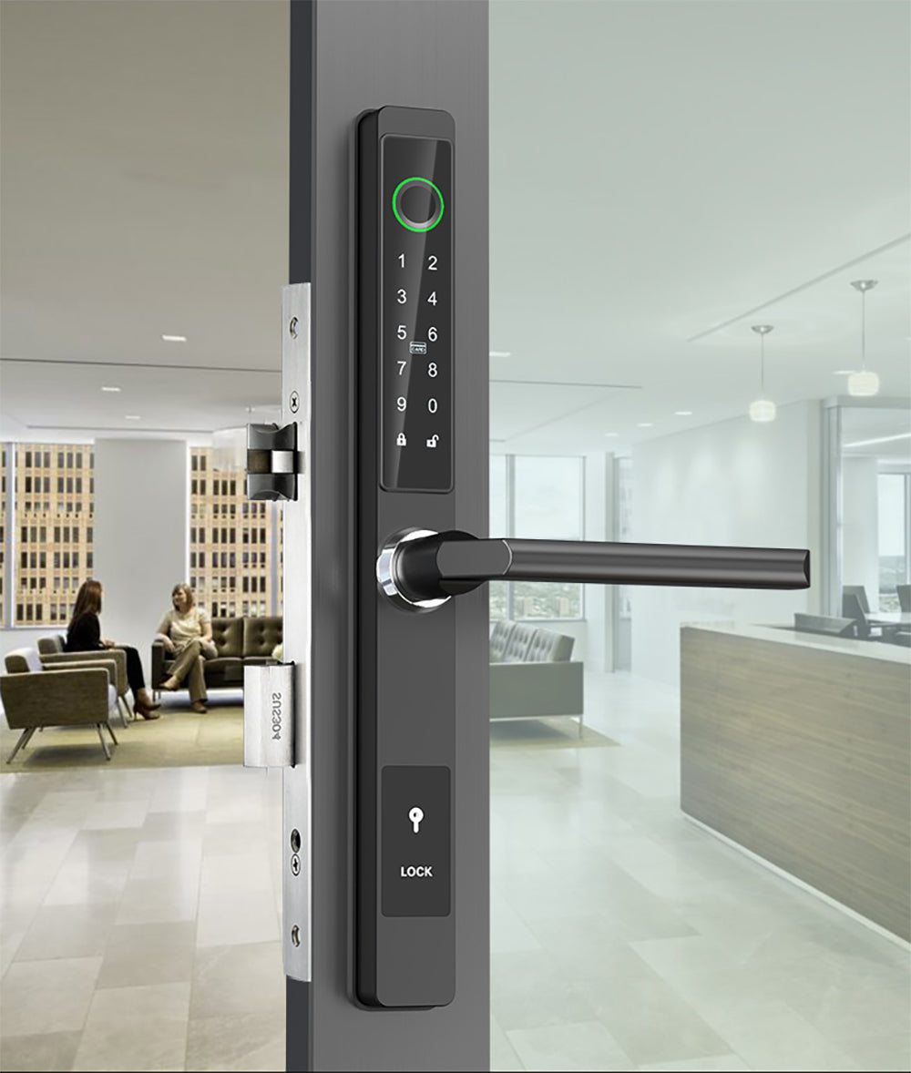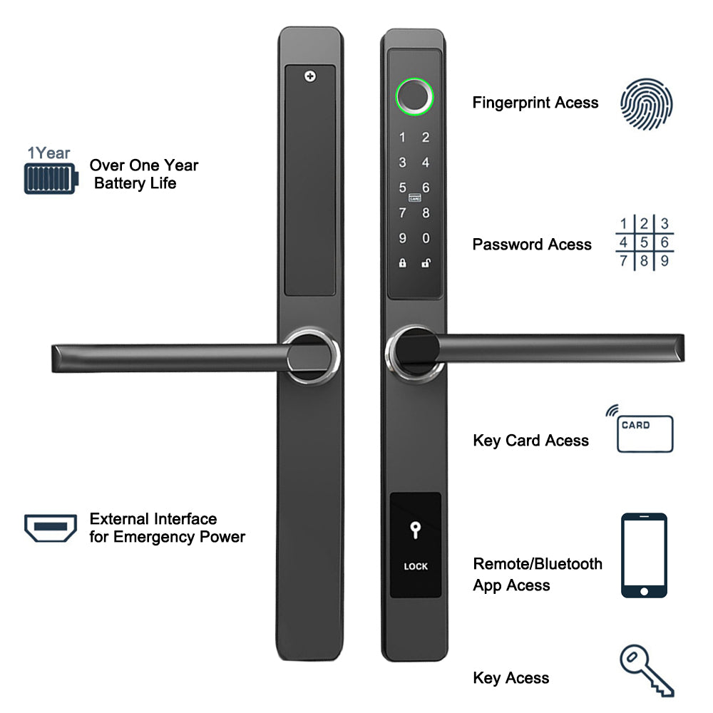 This Electronic Smart Lock is the perfect solution for those looking for a modern and efficient way to secure their front door, patio door or glass door. With features such as app, fingerprint, password, card and key unlock modes, you have multiple options to access your property. The lock is made of broken bridge aluminum material and is weather-resistant, making it suitable for all kinds of weather conditions. It is easy to install and comes with all the necessary hardware, instructions and key. The lock runs on 4 AAA batteries and easy to install. The sleek and modern design of the lock blends well with any door and adds an extra layer of security to your home or office.