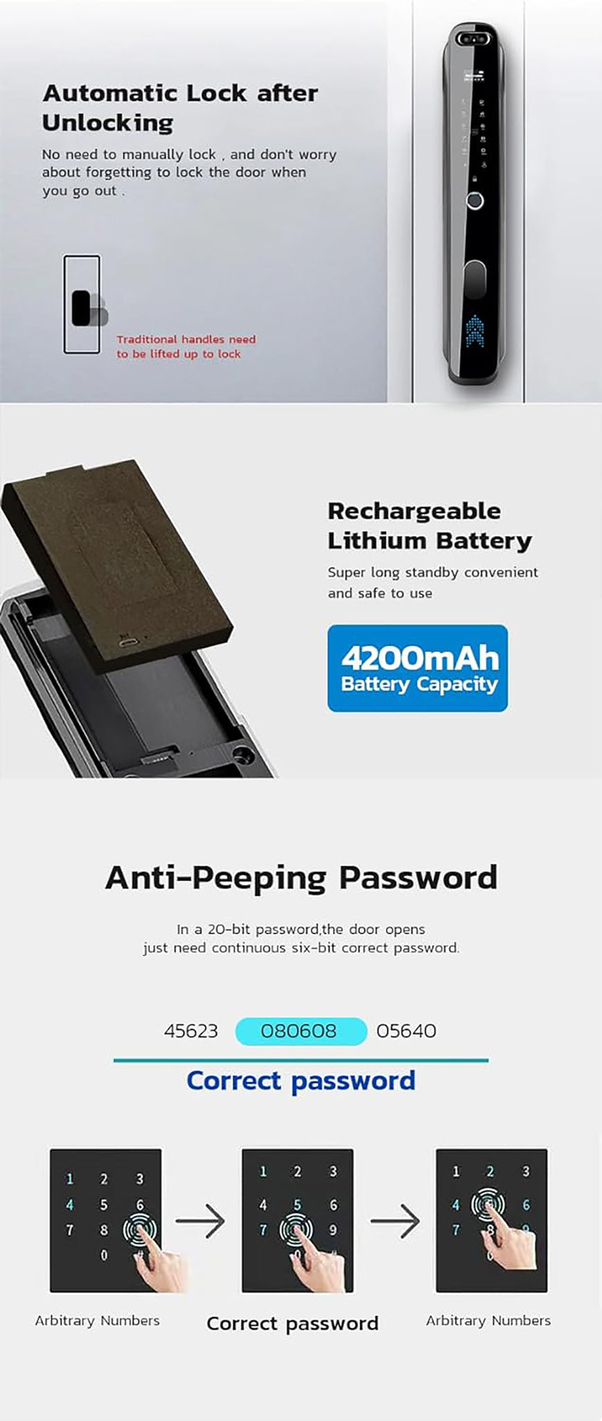- High Security: Equipped with a biometric semiconductor fingerprint sensor to prevent unauthorized access through fake fingerprints and an anti-peep password feature to enhance your privacy and protection.